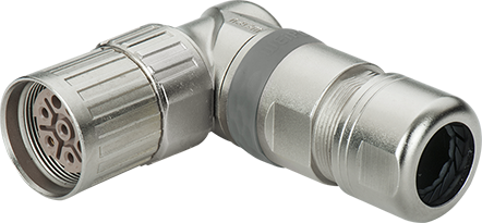 розетка кабельная экран. угловая, металл, резьба, монтаж: обжим, контактов: 6(5+PE) x 2 мм, ток: 28А, напр.: 600V, IP67, на кабель: 8-13 мм, крышка: без крышки