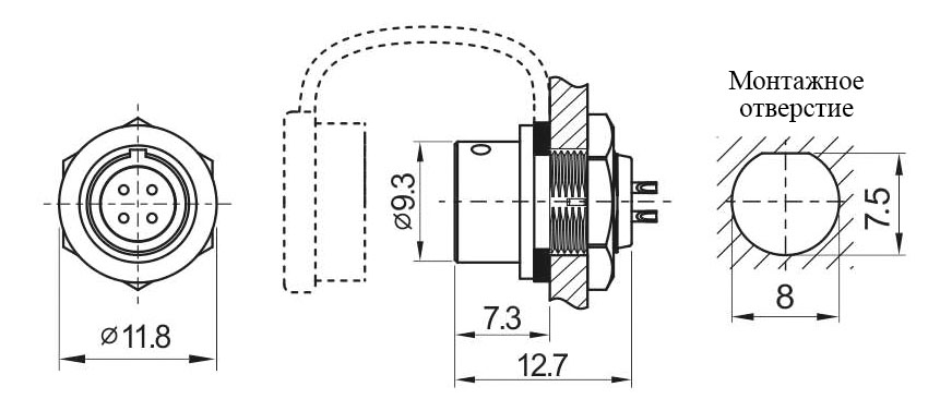 SA812/S8B розетка панельная, металл, push-pull, монтаж: пайка, контактов: 8 x 0,6 мм, ток: 3А, напр.: 30V, IP67, крышка: резиновая заглушка