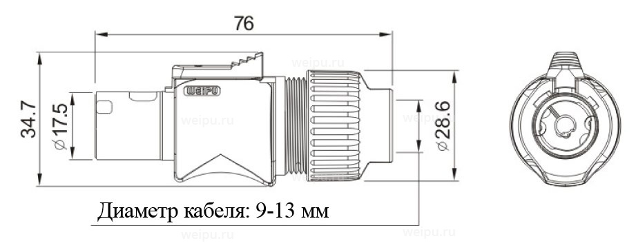 WAС3FСB трехконтактный соединитель, пластик, байонет, монтаж: винт, контактов: 3, ток: 20А, напр.: 250V, IP65, на кабель: 9-13 мм, крышка: пластик