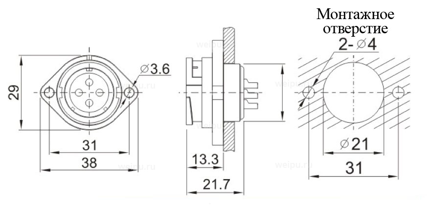 SY2113/P91C Вилка на панель с фланцем, 2 отв. Weipu