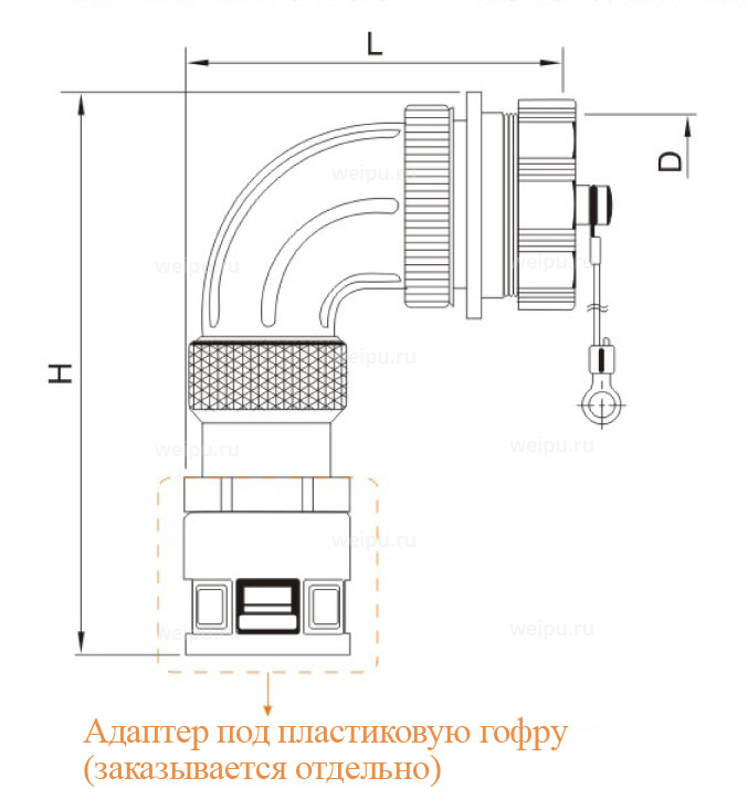 5 pin, резьба, кабельный угловой с адаптером под пластиковый рукав